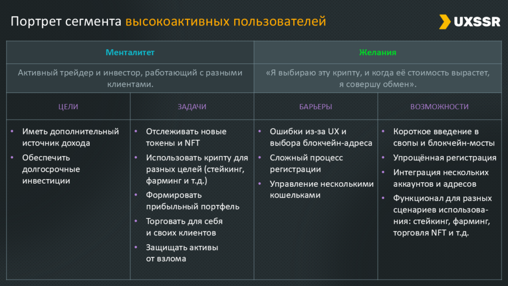 Эксперты UXSSR провели интервью с двумя сегментами: high-active — ежедневные пользователи, и low-active — редкие пользователи. Это дало понимание реальных потребностей разных групп.